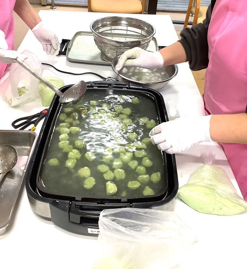抹茶と豆腐を入れて柔らかい生地を作り、丸めて茹でていきます。